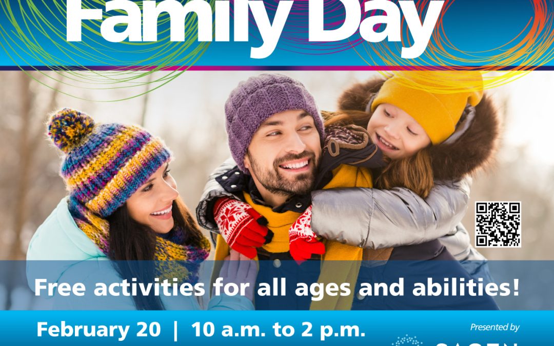 A woman, and a man with a child clinging to his neck are having a laugh outdoors in the winter. They're wearing colourful winter hats and coats.